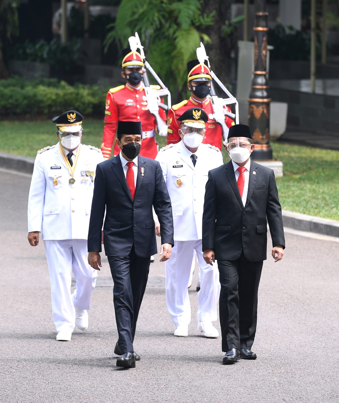Keduanya kemudian melakukan prosesi kirab menuju Istana Negara bersama dengan Presiden Joko Widodo dan Menteri Dalam Negeri, Tito Karnavian.