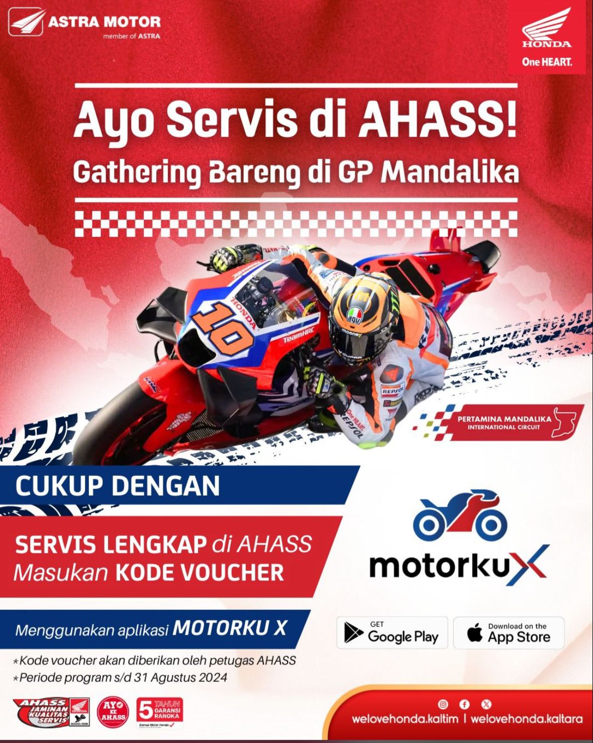 Adapun detail promo tersebut yaitu diskon ban luar 10%, Coolant diskon 5% free safety check, kampas rem diskon 5% free safety check gratis layanan cek Rangka. Tidak hanya itu, astra motor juga memberikan peluang kepada konsumen setia Honda untuk mengikuti gathering bareng di GP Mandalika 2024 dengan cara melakukan service lengkap menggunakan aplikasi motorku X hingga bulan 31 agustus 2024, konsumen yang beruntung akan ikut serta dalam gathering mandalika 2024.