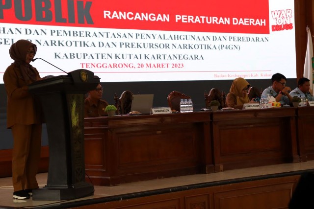 Kaltimkita.com, KUTAI KARTANEGARA - Kepala Badan Kesatuan Bangsa dan Politik (Kesbangpol) Kutai Kartanegara (Kukar) Rinda Desianti membuka kegiatan uji publik Rancangan Peraturan Daerah (Raperda) tentang Pencegahan dan Pemberantasan Penyalahgunaan dan Peredaran Gelap Narkotika dan prekursor narkotika (P4GN), di Pendopo Wakil Bupati kukar di Tenggarong, Senin ( 20/3).
