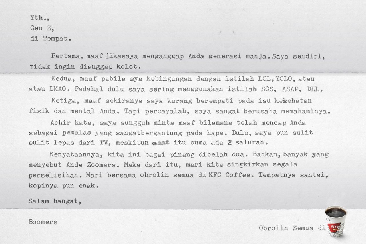 “Kami bayangkan, bagaimana jika dua generasi tersebut duduk bersama untuk saling bicara dan memahami. Dan di saat situasi seperti ini kehadiran kopi selalu dapat ditemui di berbagai negara, tak terkecuali Indonesia. Kami pikir, KFC Coffee merupakan tempat yang pas untuk mewujudkannya,” sambungnya.