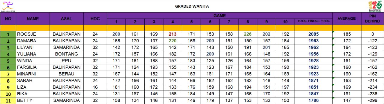 Dengan hasil ini, maka nomor bergengsi Graded Putra dan Putri pada Kejurtinas Bowling Balikpapan Open 2023 yang merupakan rangkaian kegiatan HUT ke-126 Kota Balikpapan menjadi milik atlet-atlet tuan rumah sekaligus menjadi kado hari jadi kota.