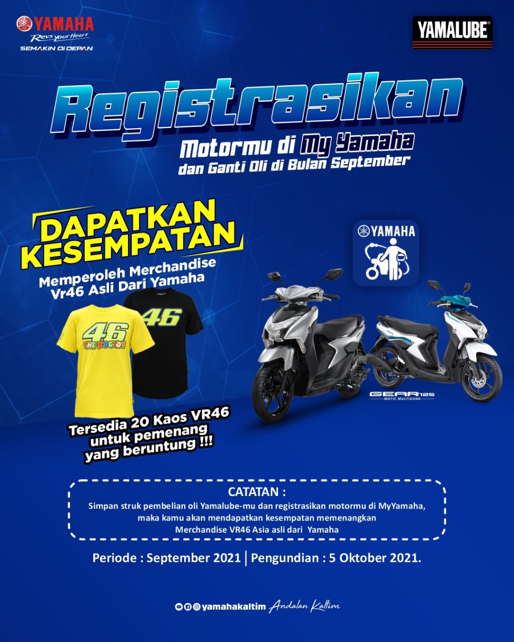 “Bagi kalian yang sudah regitrasi di My Yamaha Motor dan ganti Oli di bulan September ini, dapatkan kesempatan memperoleh merchandise VR46 asli dari Yamaha,” seru Efendy Ariadi.