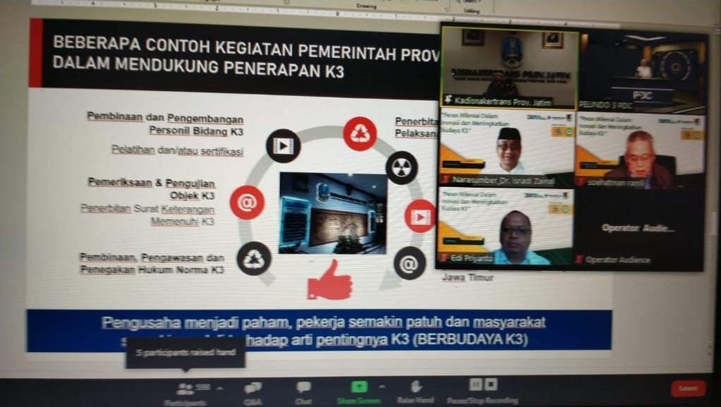 Acara yang dilaksanakan oleh BUMN Pelindo III ini dilaksanakan secara virtual dan dihadiri oleh praktisi K3, akademisi, PJK3, kaum milenial, dll. Kegiatan diawali denagn opening Speech dari Direktur SDM Pelindo III dan sambutan dari Kadisnakertran Jawa timur.