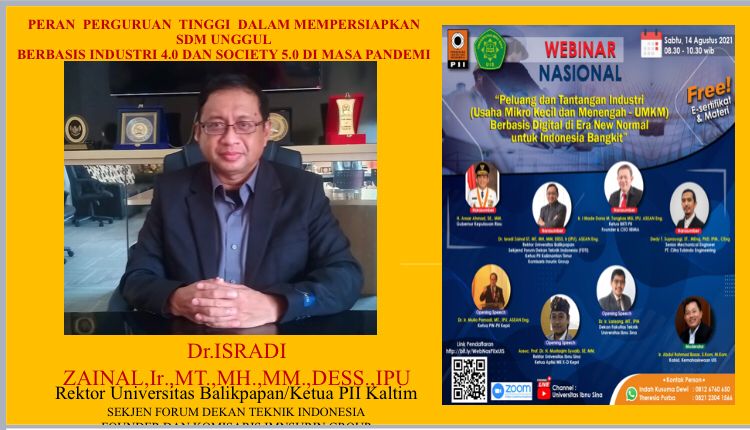KaltimKita.com, BALIKPAPAN - Rektor Universitas Balikpapan Dr Isradi Zainal menjadi pemateri dalam webinar nasional yang dilaksanakan Fakultas Teknik Universitas Ibnu Sina bekerja sama dengan Pengurus Wilayah Persatuan Insinyur Indonesia PW PII Kepri.