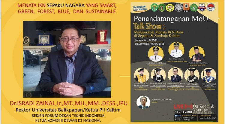 Hal itu disampaikan saat menjadi narasumber pada webinar talk show dan penandatangan MoU antara Uniba dan UGM, Universitas Bosowa, Persatuan Insinyur Indonesian, dan Pemkab PPU yang disaksikan oleh Gubernur Kaltim Dr. Isran Noor, Rektor Unmul Prof Masjaya dan Pembina yayasan DWK Dr. Rendy Susiswo Ismail (6/7/2021)