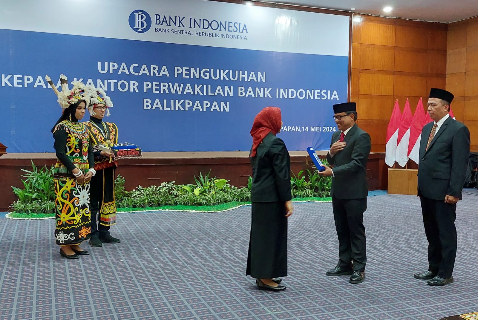 Kaltimkita.com, BALIKPAPAN - Deputi Gubernur Bank Indonesia (BI), Ibu Aida S. Budiman secara resmi mengukuhkan Robi Ariadi sebagai Kepala Perwakilan Bank Indonesia Balikpapan menggantikan Bambang Setyo Pambudi yang telah memasuki masa purnabakti dalam pelaksanaan upacara pengukuhan, di ruang Beruang Madu Kantor Perwakilan BI Balikpapan, Selasa (14/5/2024).