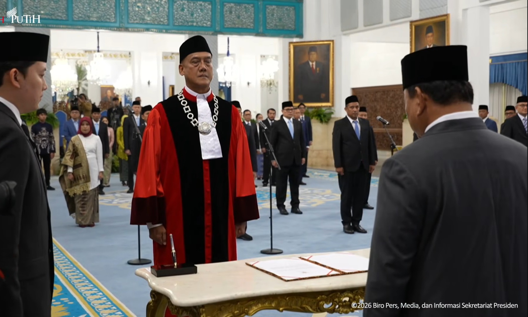 Pengambilan sumpah jabatan hakim konstitusi tersebut digelar di Istana Negara, Jakarta, Jumat (10/4/2026) siang. Pengambilan sumpah jabatan disaksikan langsung oleh Prabowo.