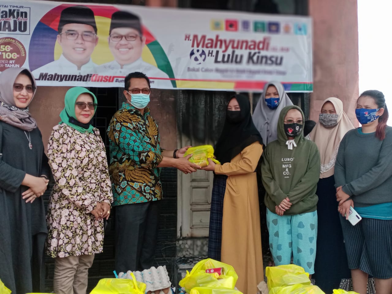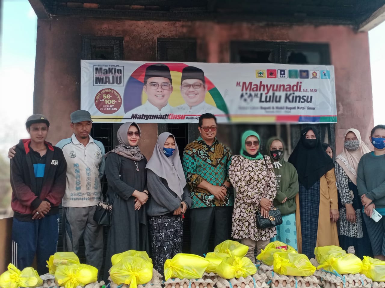 Penasehat Srikandi MaKin Kutim mantan anggota DPR-RI Komisi V Bunda Hj Agati Sulie bersama suami tercinta Wakil Ketua DPD RI Dr H Mahyudin ST MM didampingi istri cabup Kutim Mahyunadi unda Hj Masriati spontanitas menggalang bantuan berupa sembako dan santunan.