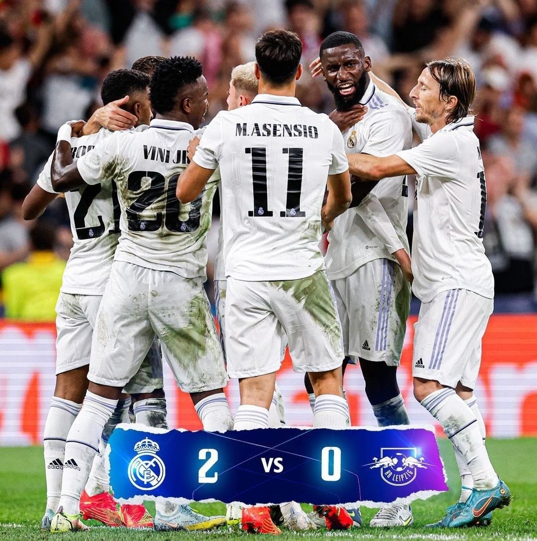 Real Madrid menang 2-0 atas RB Leipzig. Setelah lolos dari tekanan Leipzig, Madrid menang berkat gol Federico Valverde & Marco Asensio di babak kedua.