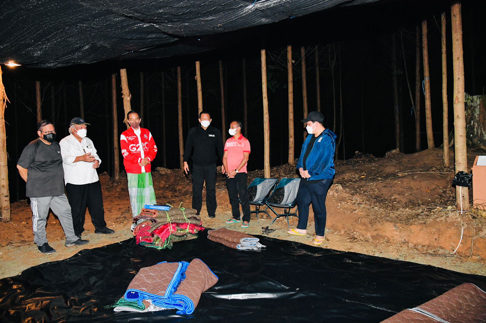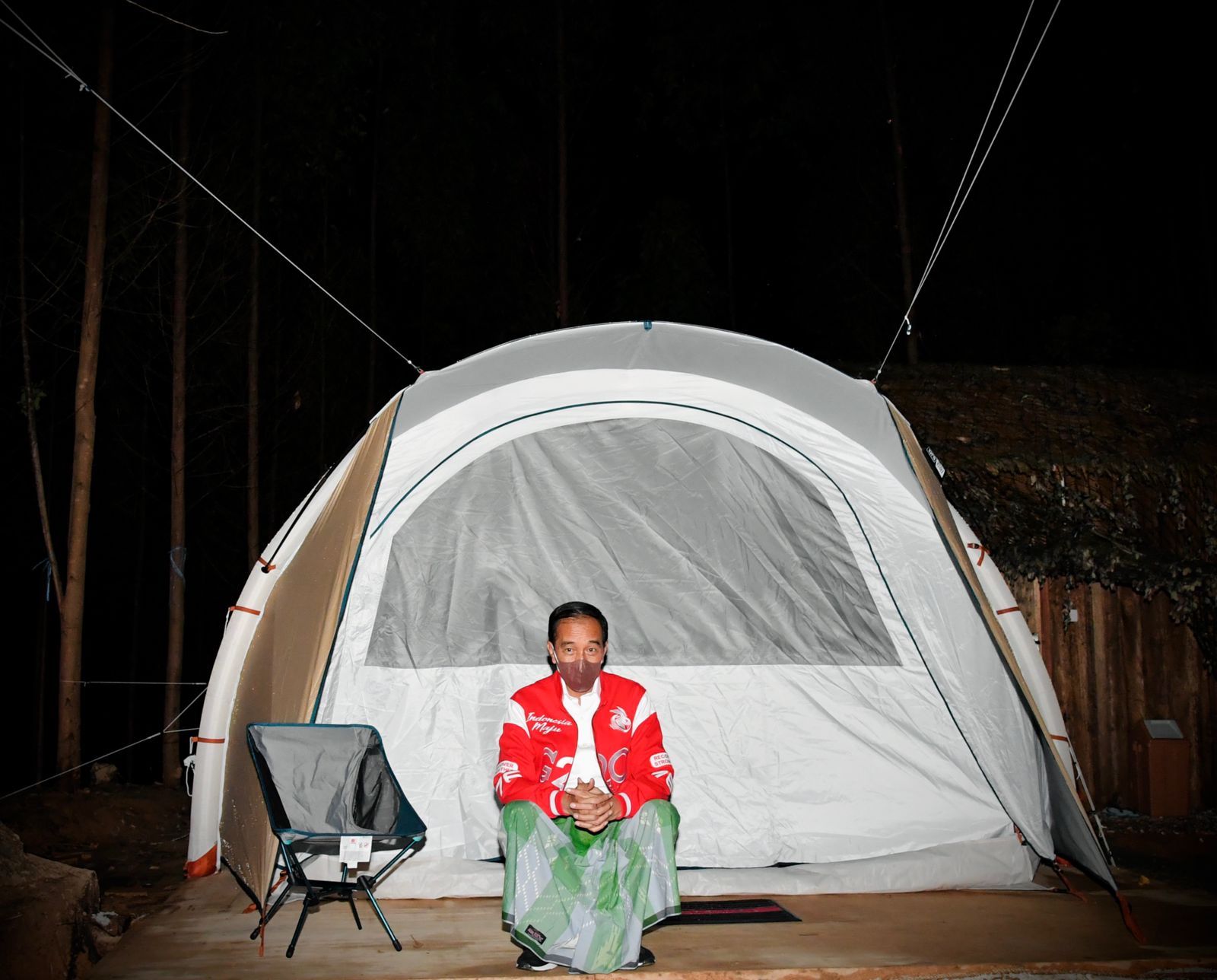 Kaltimkita.com, SEPAKU - Udara sejuk dan cuaca cerah terasa pada malam hari di Ibu Kota Nusantara (IKN) di tempat Presiden Joko Widodo bermalam, Senin, 14 Maret 2022. Presiden Jokowi yang tampak mengenakan jaket merah bermotif G20 dan sarung bermotif kotak keluar dari tenda tempatnya bermalam sekitar pukul 22.15 WITA.