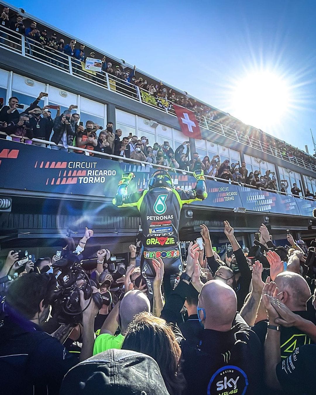 Valentino Rossi sudah menyelesaikan kariernya di MotoGP 2021. The Doctor dielu-elukan di pitlane dan paddock sirkuit Ricardo Tormo, Valencia.