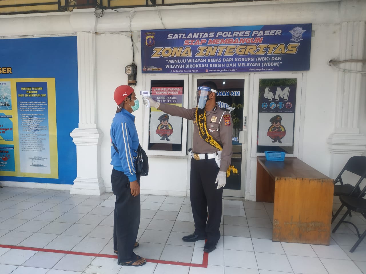 Indrawan memastikan pelayanan SIM di Satlantas Polres Paser telah mematuhi protokol kesehatan. Sebelum masuk ke ruangan pelayanan, pemohon wajib juga wajib memakai masker. (mh/and)