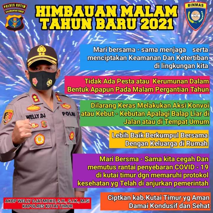 Untuk itu tak ada kata bosan terucap dari suara lantang sang komando pucuk pimpinan teras Mapolres Kutim, Kapolres Kutim AKBP Welly Djatmoko, SH S.,Ik, M.,Si kepada segenap jajaran. “Pesan moril yang menjadi satu kesatuan baik dari sisi kamtibmas, kesehatan dunia (protokol kesehatan) cegah covid-19 di Kutim, hindari kerumunan social distancing, jaga jarak, berikan rasa aman, nyaman tentram dari kebisingan deru knalpot racing yang tidak lagi standar dari pabrikan, tekan lakalantas “stop balap liar” banyak berkumpul dengan keluarga di rumah, tingkatkan ibadah, panjatkan doa agar pada 2021 Kutim kian kondusif serta terutama terbebas dari covid-19 terus intens disosialisasikan,”ungkap perwira menengah atas dengan pangkat dua bunga (keemasan) di pundak.