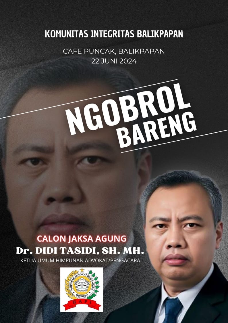KaltimKita.com, BALIKPAPAN - Komunitas Integritas Balikpapan segera mengelar ngobrol bareng, 22 Juni 2024 mendatang di Kafe Puncak. Menghadirkan Dr. Didi Tasidi SH. MH, calon jaksa agung.