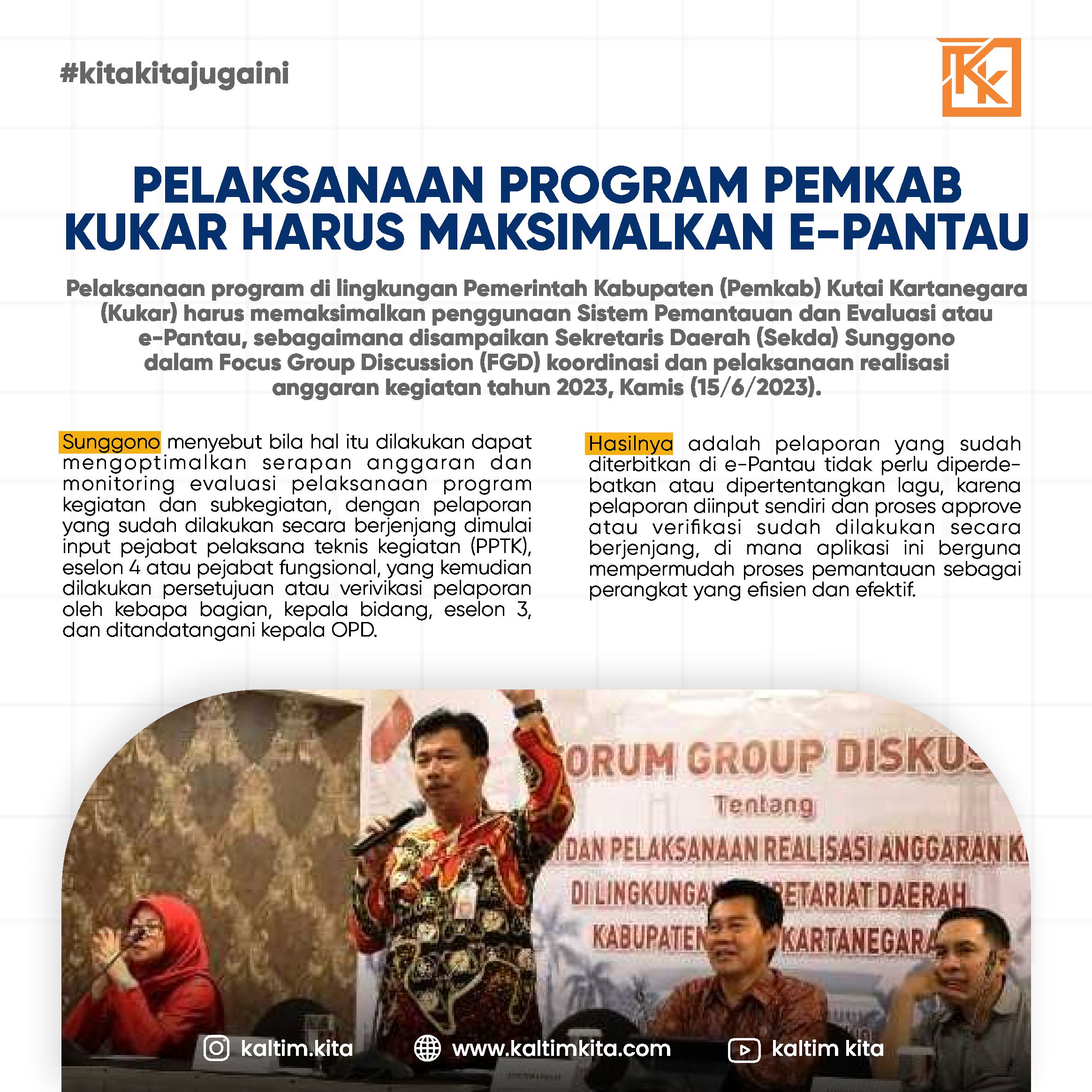 Kaltimkita.com, KUTAI KARTANEGARA – Sekretaris Daerah (Sekda) Kutai Kartanegara (Kukar) Sunggono meminta agar Sistem Pemantauan dan Evaluasi (e-Pantau) di situs https://e-pantau.kukarkab.go.id/, agar dimaksimalkan.