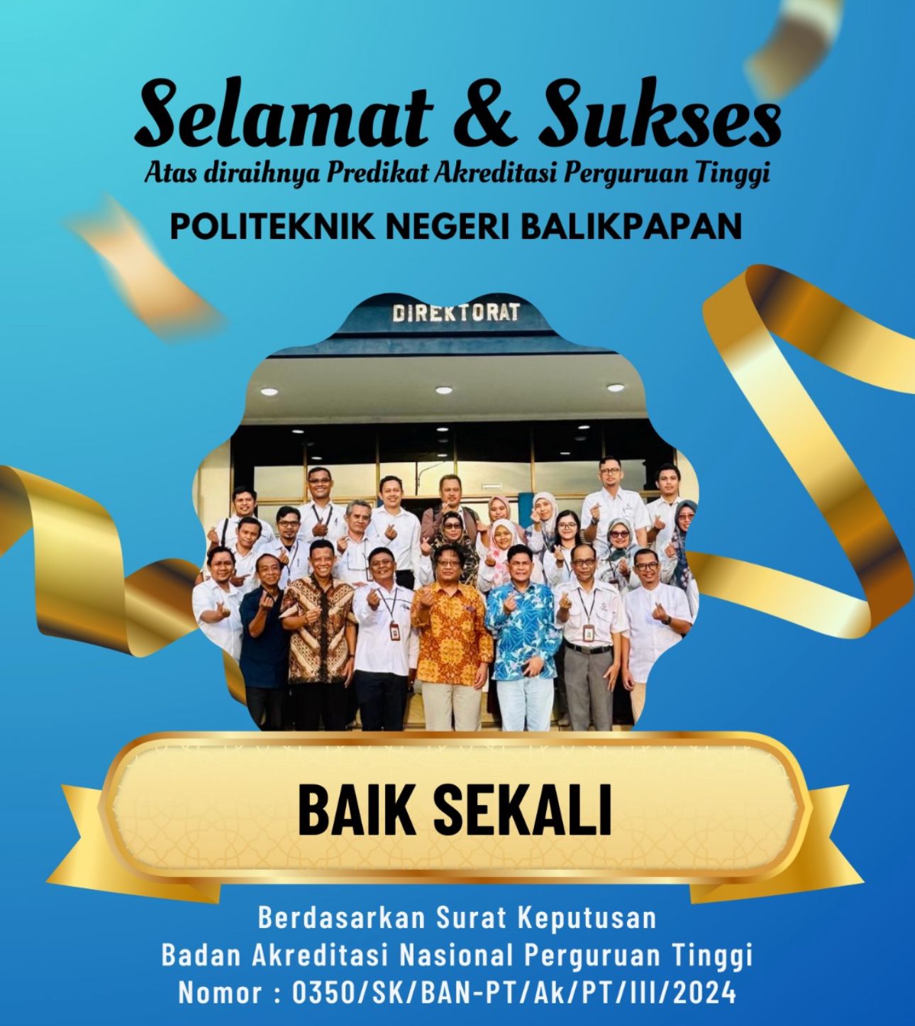 KaltimKita.com, BALIKPAPAN - Momentum yang menggembirakan! Politeknik Negeri Balikpapan telah mendapat pengakuan atas dedikasi dan kualitas pendidikannya. Ya kampus vokasi di Kota Minyak ini berhasil meraih predikat akreditasi Baik Sekali. Hal ini diterima setelah, Jumat (15/3/2024) lalu mendapat kunjungan dari Badan Akreditasi Nasional Perguruan Tinggi (BAN PT) untuk melakukan asesmen lapangan.