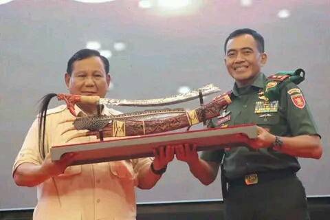 Pangdam Tri Budi Utomo menyerahkan cenderamata mandau kepada Menhan Prabowo.
