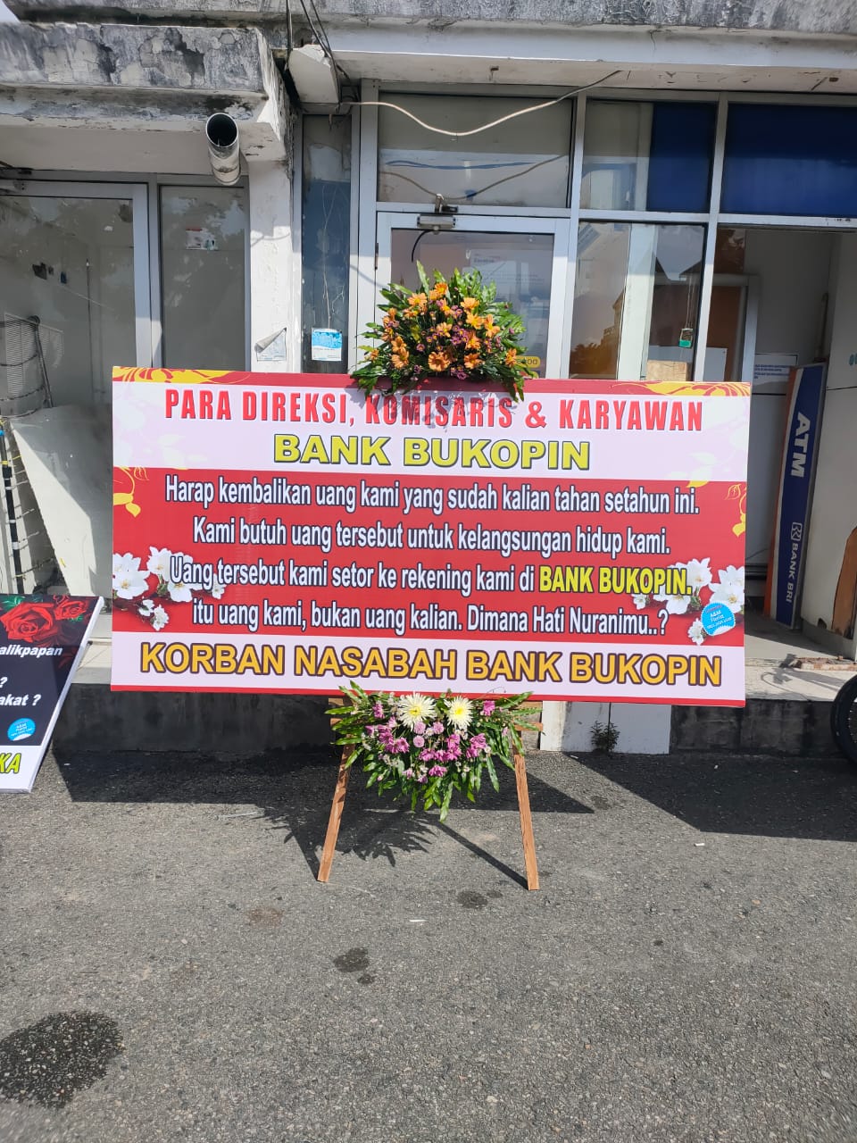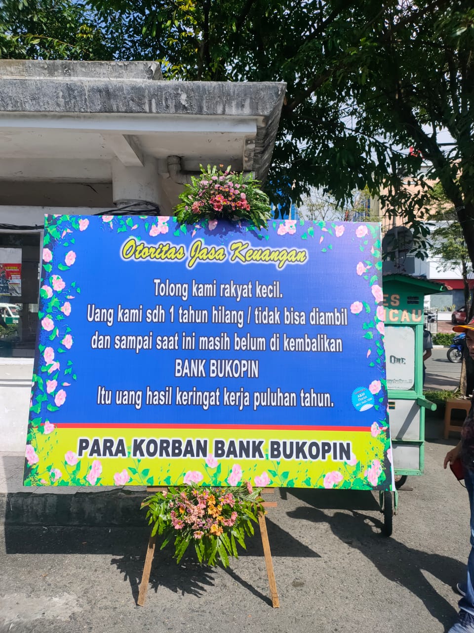 "Otoritas Jasa Keuangan. Tolong kami rakyat kecil. Uang kami sudah satu tahun hilang, tidak bisa diambil. Dan sampai saat ini belum dikembalikan oleh Bank Bukopin. Itu uang hasil keringat kerja puluhan tahun," tulis salah satu karangan bunga korban nasabah Bank Bukopin.