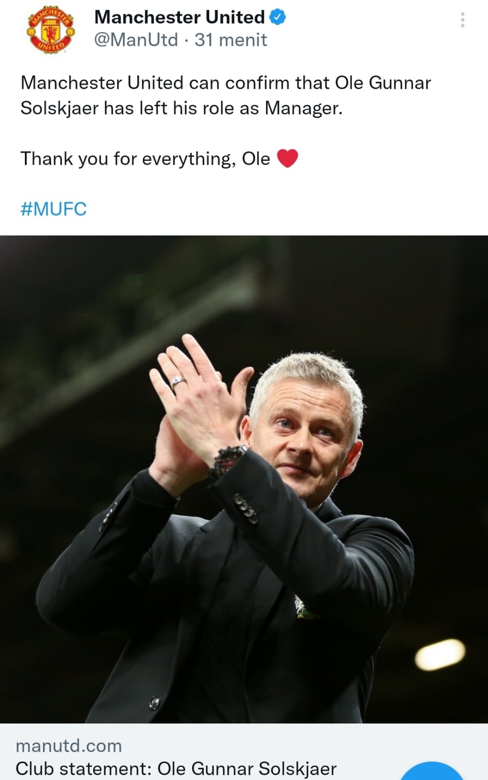 "Manchester United mengumumkan Ole Gunnar Solskjaer sudah menninggalkan posisinya sebagai manajer," demikian pernyataan di situs resmi MU.