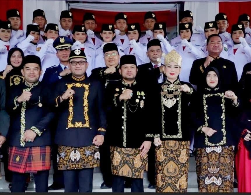 Gubernur Kaltim Rudy Mas’ud, Wagub Seno Aji dan Ketua DPRD Kaltim Hasanuddin Mas’ud bersama istri pada Upacara HUT ke-80 Kemerdekaan di Samarinda.