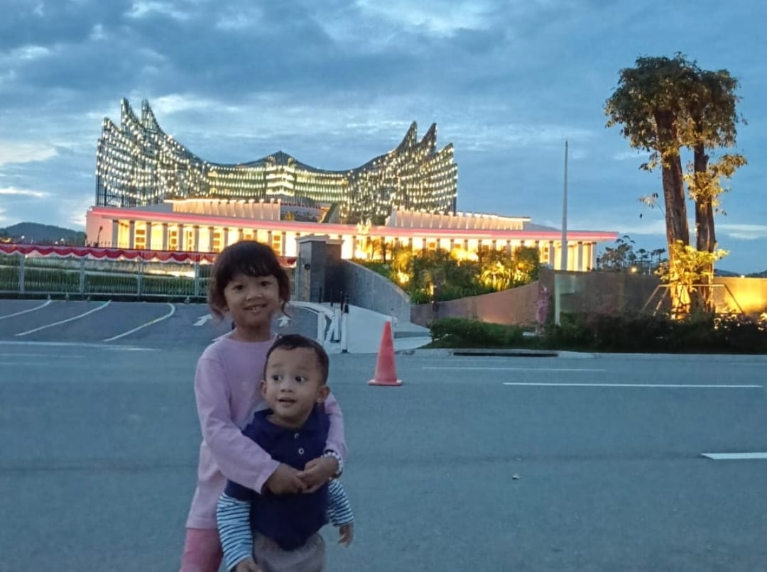 Cucu saya Jena dan Aby dengan latar belakang Istana Garuda IKN yang cantik dan megah di waktu malam.