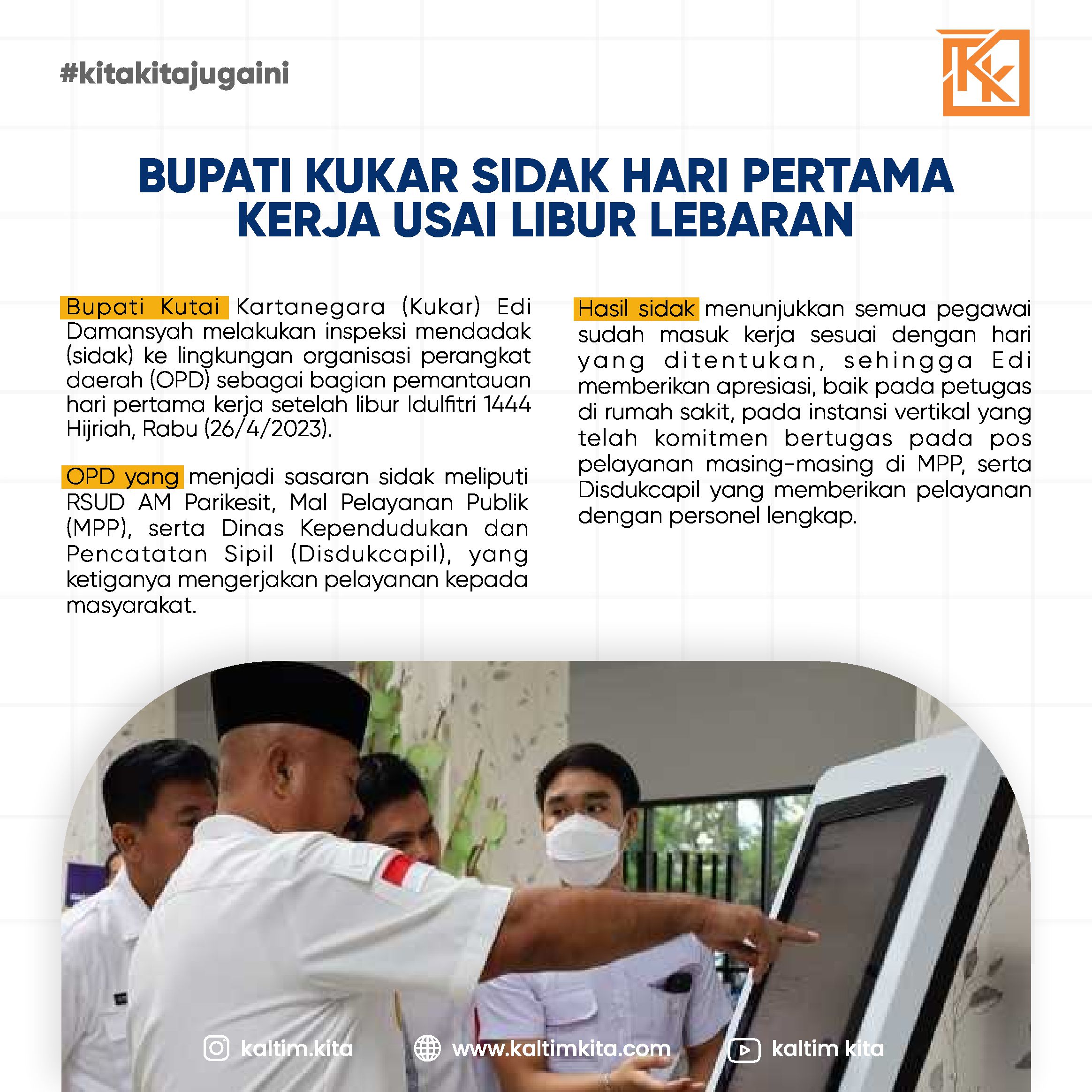 Kaltimkita.com, KUTAI KARTANEGARA – Bupati Kutai Kartanegara (Kukar) Edi Damansyah melakukan inspeksi mendadak (sidak) di lingkungan kerja OPD, diantaranya, mengunjungi Rumah Sakit Aji Muhamad Parikesit Tenggarong Seberang, Mal Pelayanan Publik (MPP) dan Dinas Kependudukan dan Pencatatan Sipil (Disdukcapil), Rabu (26/4/23).