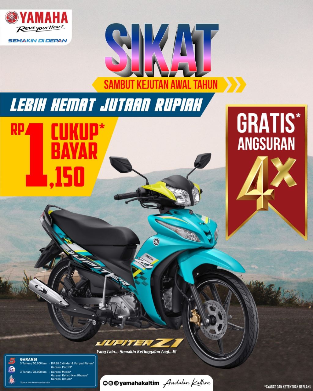 Dengan promo SIKAT, alias Sambut Kejutan Awal Tahun, menurut Efendy Ariadi kalian yang ingin membawa pulang motor kencang di kelasnya yakni Yamaha Jupiter Z1 cukup hanya dengan membayar uang muka alias down payment (DP) sebesar Rp 1,150 Ribu* (syarat dan ketentuan berlaku).