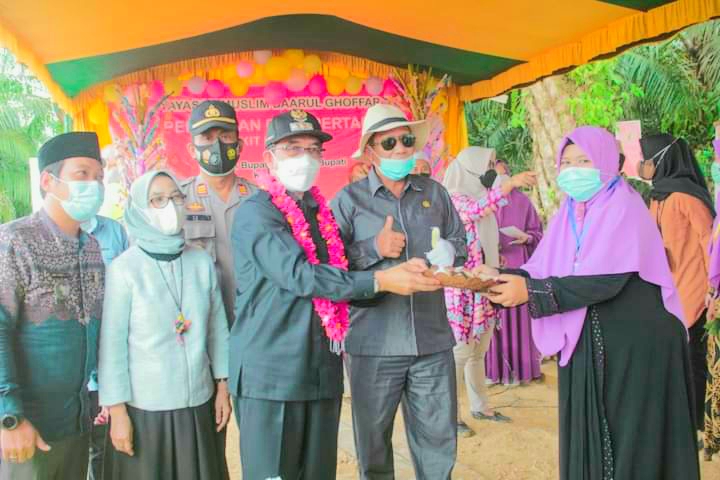 Sukses peletakan batu pertama sekolah Yayasan Daarul Ghoffar dirangkai pemotongan tumpeng yang diserahkan oleh Bupati Ardiansyah didampingi anggota dewan Kidang dan Kapolsek Bengalon AKP Slamet Riyadi