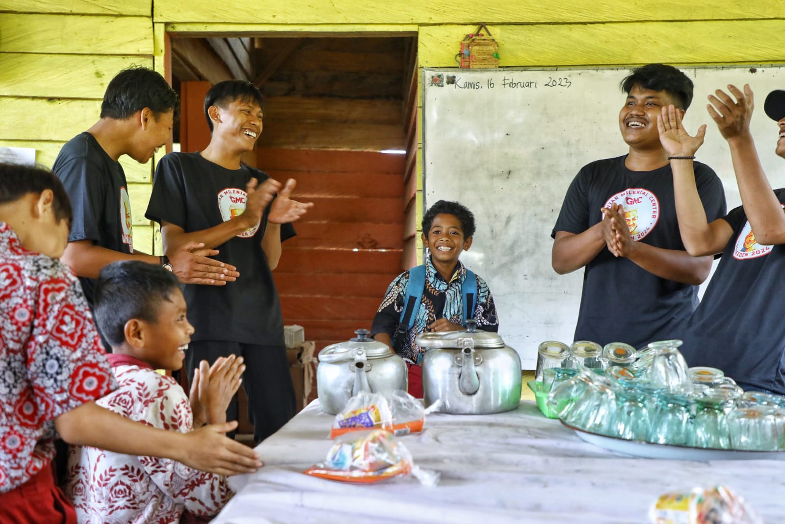 Setiba di lokasi, para pelajar menyambut mereka dengan riang gembira dan penuh semangat. Keceriaan bertambah ketika edukasi wawasan kebangsaan seperti pengenalan pancasila, permainan menarik untuk merangsang daya ingat, hingga bernyanyi “laskar pelangi” bersama para milenial berlangsung.