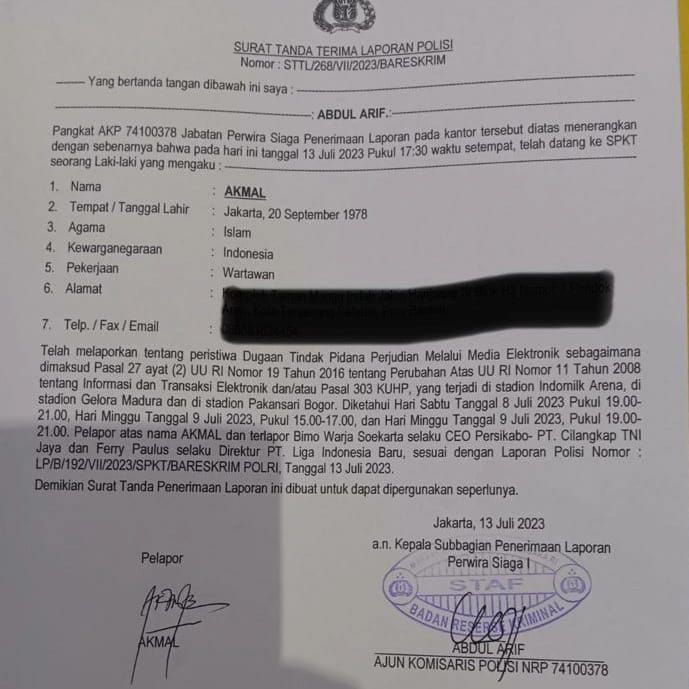 Kaltimkita.com, JAKARTA - Save Our Soccer #SOS, melapor ke Bareskrim Kepolisian Republik Indonesia terkait masifnya promosi rumah judi SBOTOP di Liga 1 Indonesia. Kamis, 13 Juli 2023, laporan SOS diterima dengan nomor bukti laporan STTL/268/VII/2023/BARESKRIM. Jumat, 14 Juli 2023 sponsor rumah judi yang melekat di jersey Persikabo 1973 dan di aboard dicopot.