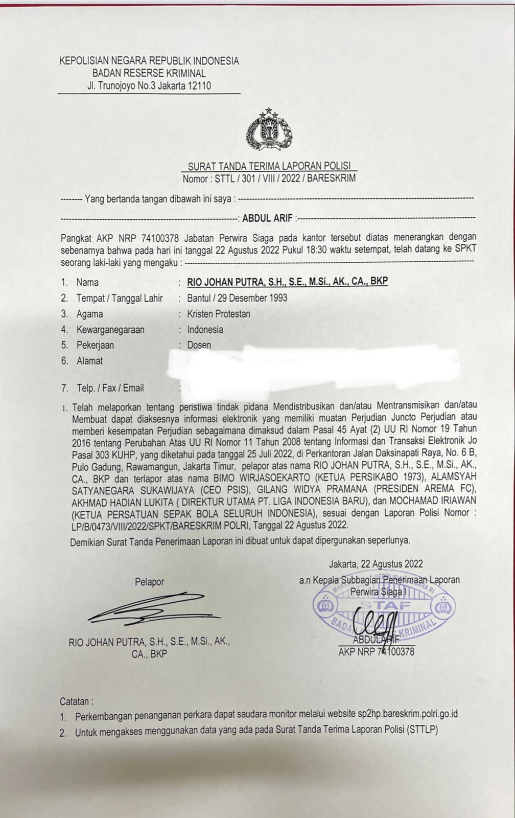 Kaltimkita.com, JAKARTA - Demi masa depan sepakbola Indonesia yang lebih baik dan berprestasi, Save Our Soccer #SOS mendukung penuh langkah Rio Johan Putra SE. SH. MSi. Ak CA BKP, seorang pecinta bola dan akademisi/dosen FEBIS Universitas Tujuh Belas Agustus (Untag) 1945 Jakarta yang melapor ke Bareskrim Polri terkait rumah judi yang menjadi sponsor klub Liga 1 Indonesia. Pihak Bareskrim Polri telah mengeluarkan Surat Tanda Terima Laporan Polisi bernomor: STTL/301/VIII/2022/Bareskrim, tertanggal 22 Agustus 2022 untuk menindak sexara hukum pelegalan judi melalui promosi di klub sepakbola Indonesia. Sementara laporan polisinya sendiri bernomor: LP/B/0473/VIII/2022/Bareskrim.