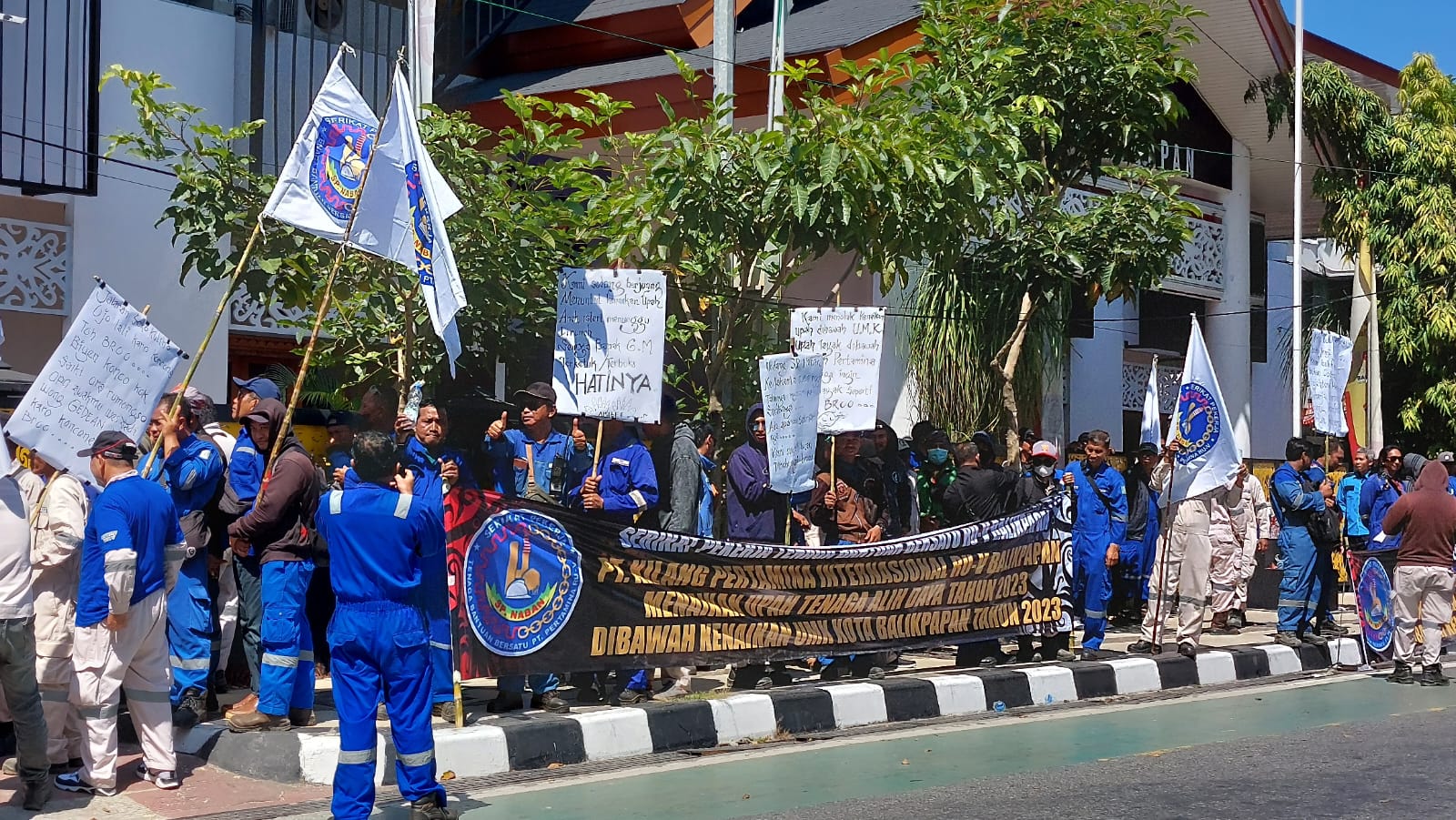 Aksi demonstran SP Naban di Gedung DPRD, yang ramai-ramai menuntut kenaikan Gaji berdasarkan upah UMK 2023 Kota Balikpapan.