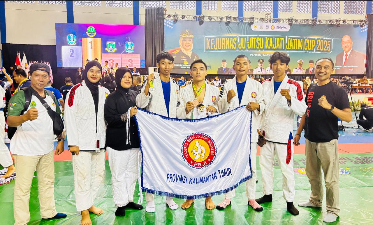 KaltimKita.com, BALIKPAPAN – Kaltim tampil maksimal di ajang Kejuaraan Nasional Jujitsu Kajati Jatim 2025 di Pacitan, Jawa Timur. Dua medali sukses diraih yang berlangsung selama dua hari, 14-15 Februari 2025. Ya, Rangga Dwi Saputra meraih perak di kategori fighting system -56 Kg putra dan Marchel Liyong di kategori newaza -59 Kg putra.