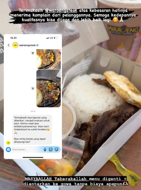 "Terima kasih @waroengsteak atas kebesaran hatinya menerima komplain dari pelanggannya. Semoga ke depannya kualitasnya bisa dijaga dan lebih baik lagi," ujarnya bangga. (lex)