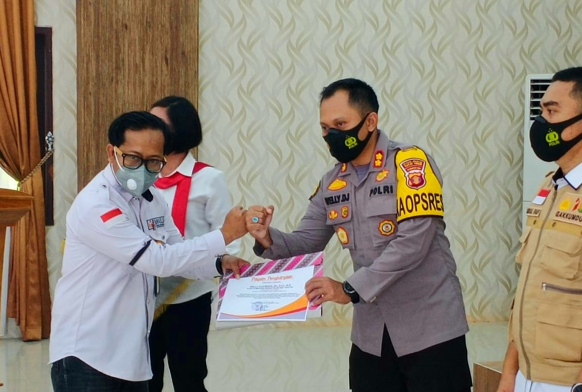 Salam komando protokol covid-19 saat ketua Bawaslu Andi Mappasilling bersama Kapolres Kutim AKBP Welly serah terima penghargaan piagam.