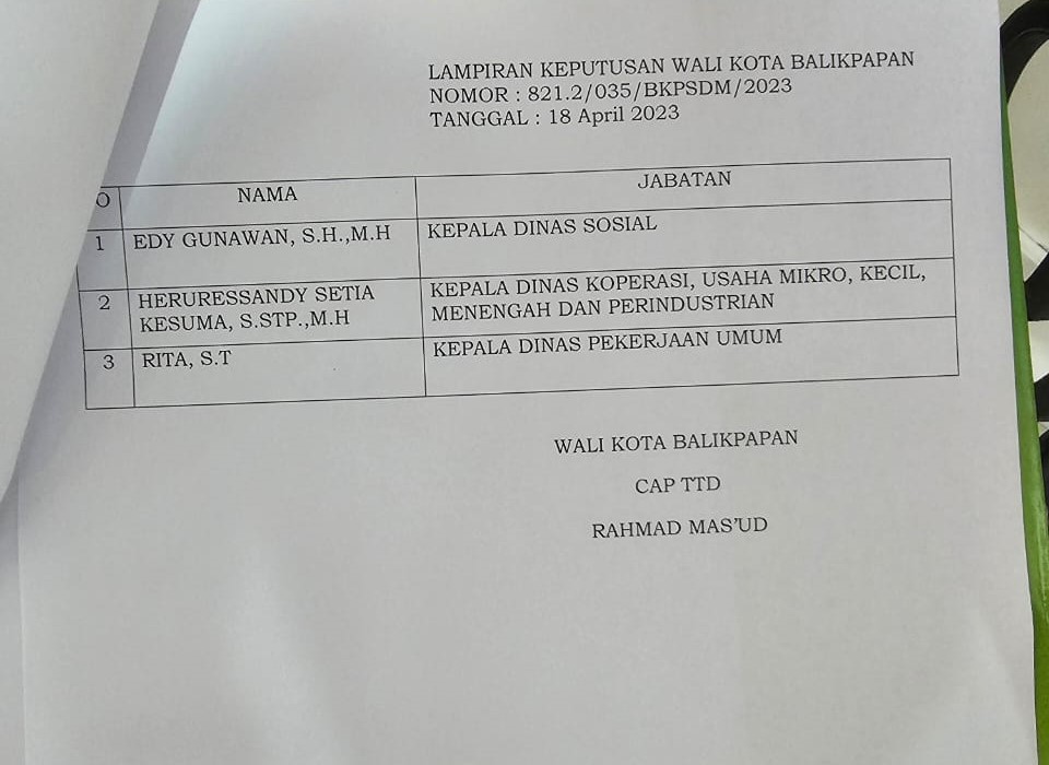Adapun jabatan yang baru dilantik yakni, Edy Gunawan yang sebelumya menjabat Camat Balikpapan Tengah jadi Kepala Dinas Sosial (Dinsos) Balikpapan, Rita yang sebelumnya menjabat Kabag Pembangunan Setdakot menjadi Kepala Dinas Pekerjaan Umum (DPU) Balikpapan, dan Heruressandy Setia Kesuma sebelumnya menjabat Camat Balikpapan Selatan mengisi jabatan bari Kepala Dinas Koperasi UMKM dan Perindustrian (DKUMKMP) Balikpapan.