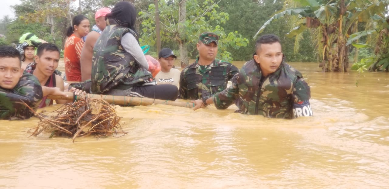 Danyonif 621/Mtg Mayor Inf Yoga Yastinanda memimpin langsung aksi menyelamatkan masyarakat/penduduk yang terkena banjir di Kab Hulu Sungai Tengah.