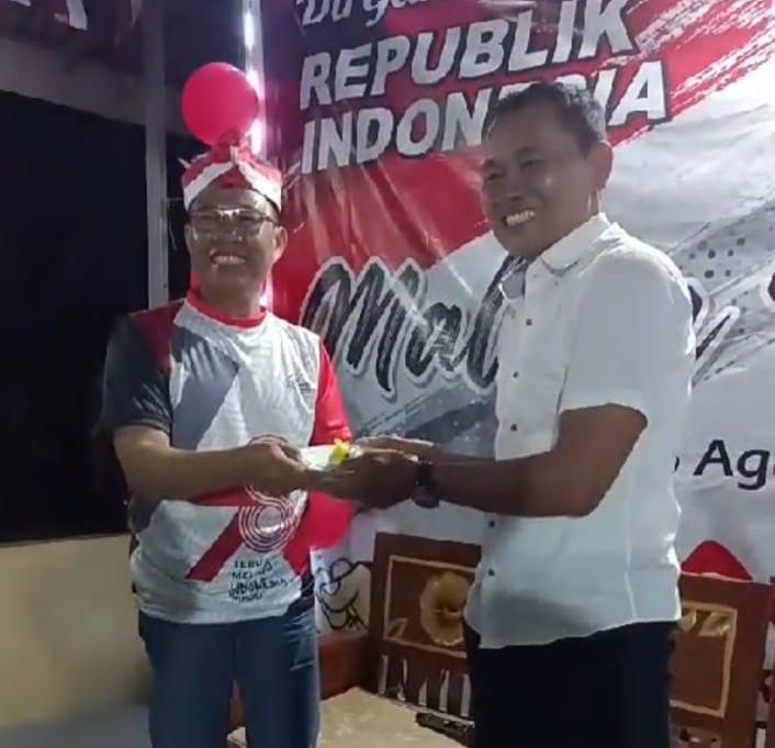 BENTUK SYUKURAN: Ketua RT 34 Erlan Aminoto memberikan potonngn tumpeng kepada Kanit Intelkam Polsek Balikpapan Selatan AKP Haryono Kiswoyo usai malam renungan kemerdekaan.