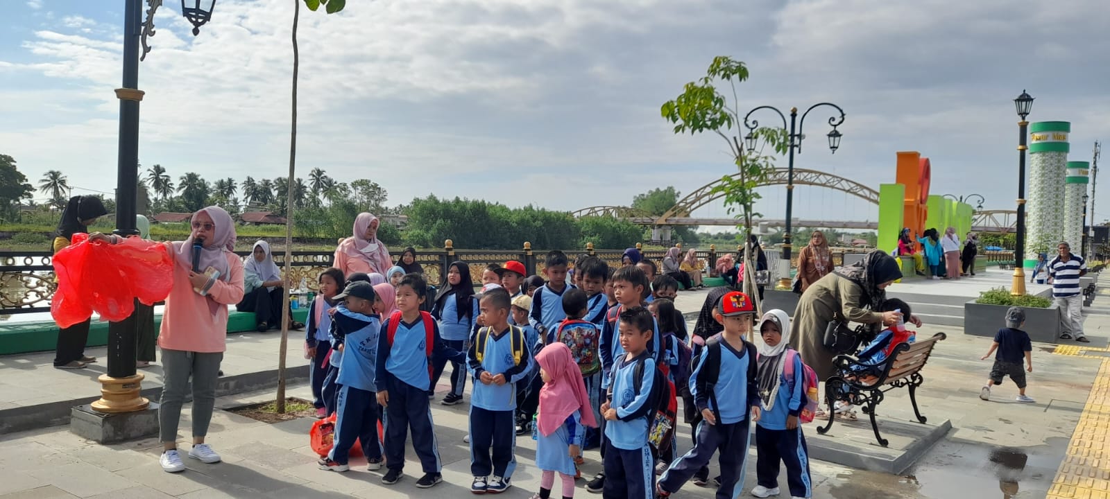 TANA PASER - Puluhan siswa-siswi Taman Kanak-kanak (TK) Umi Za Tanah Grogot menggelar pembelajaran di luar sekolah. Lokasi yang dipilih untuk belajar di alam terbuka adalah Taman Tepian Siring Kandilo.