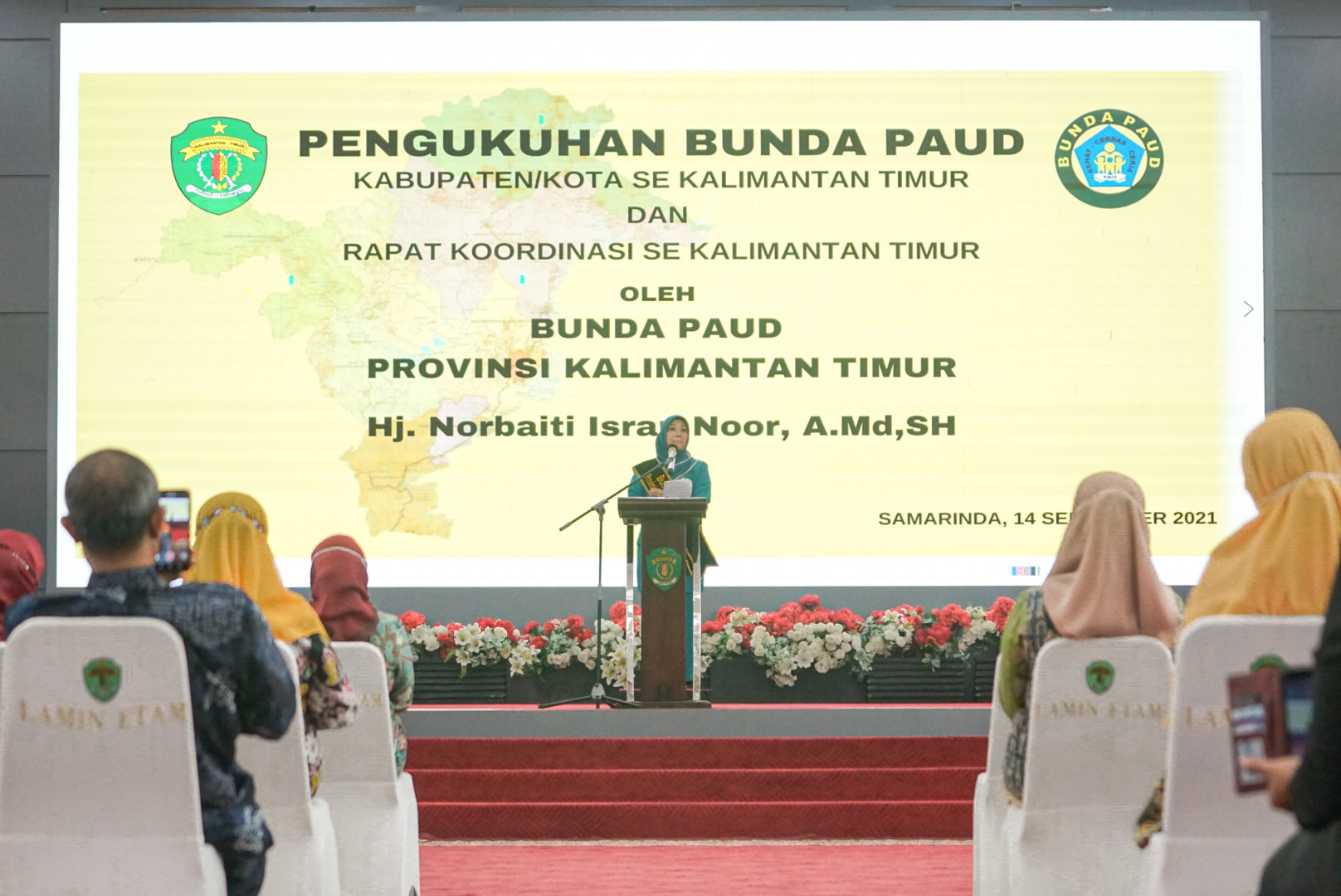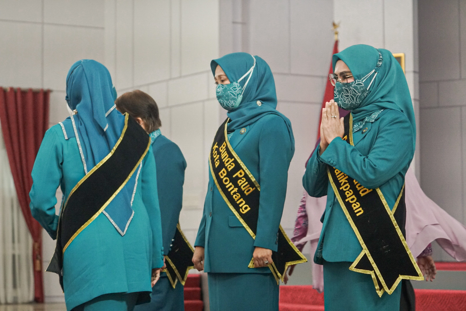 Kaltimkita.com, SAMARINDA - Sejumlah Bunda Pendidikan Anak Usia Dini (PAUD) tingkat Kota dan Kabupaten di Provinsi Kalimantan Timur, salah satunya Nurlena Rahmad Mas'ud sebagai Bunda PAUD Kota Balikpapan periode 2021-2025 yang mengikuti kegiatan pengukuhan langsung dilakukan Bunda PAUD Kaltim yang juga Ketua TP-PKK Provinsi Kaltim Norbaiti Isran Noor di Pendopo Odah Etam, Samarinda, Selasa (14/9/2021)