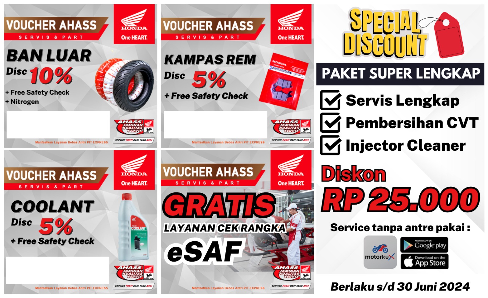 Adapun detail promo tersebut yaitu diskon ban luar 10%, Coolant diskon 5% free safety check, kampas rem diskon 5% free safety check gratis layanan cek Rangka.