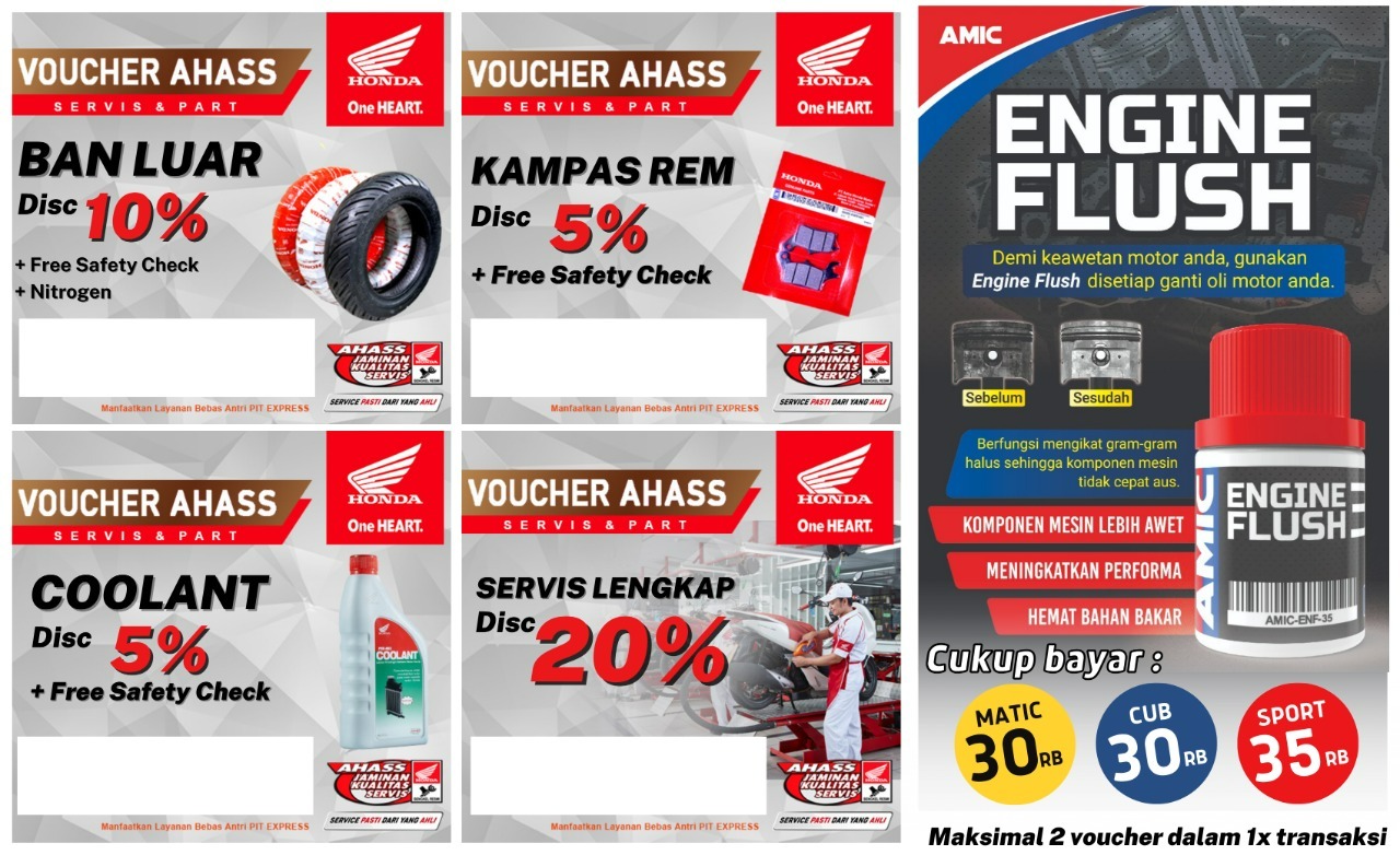 Adapun detail promo tersebut yaitu diskon servis Lengkap 20%, promo khusus Ban Luar diskon 20% + free safety check dan nitrogen, promo khusus coolant diskon 5% + free safety check, promo kampas rem diskon 5% + free safety check serta promo engine flush Rp 30.000 untuk matic dan cub, Rp 35.000 untuk motor sport.