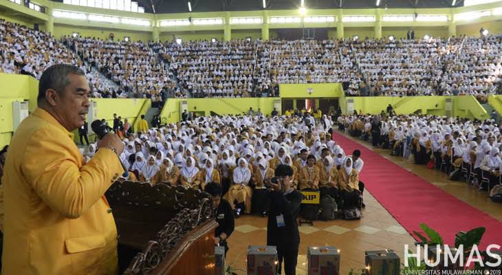 Rektor Unmul Prof Masjaya di depan ribuan mahasiswa Unmul.