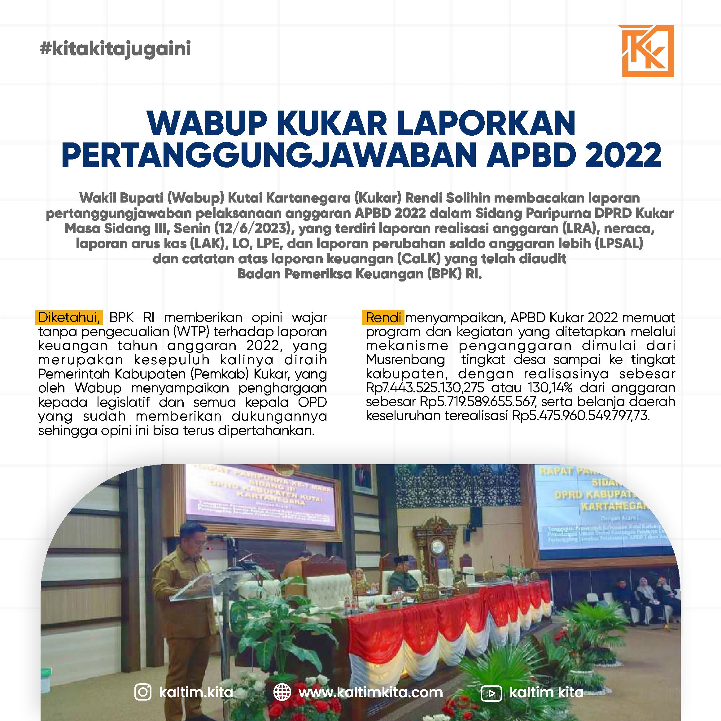 Rendi Solihin dalam penyampaian laporan tersebut terdiri atas Laporan Realisasi Anggaran (LRA), Neraca, Laporan Arus Kas (LAK), LO, LPE dan Laporan Perubahan Saldo Anggaran Lebih (LPSAL) dan Catatan atas Laporan Keuangan (CaLK) yang telah diudit oleh BPK RI, yang merupakan kewajiban Pemerintah Kabupaten Kutai Kartanegara (Pemkab Kukar) untuk penyusunan dan menyampaikan kepada DPRD sebagaimana diatur dalam ketentuan yang ada. Badan Pemeriksa Keuangan Republik Indonesia memberikan Opini Wajar Tanpa Pengecualian (WTP) terhadap Laporan Keuangan Pemerintah Daerah Kabupaten Kutai Kartanegara Tahun Anggaran 2022. Opini WTP ini adalah WTP yang kesepuluh kalinya diperoleh Pemerintah Kabupaten Kutai Kartanegara.