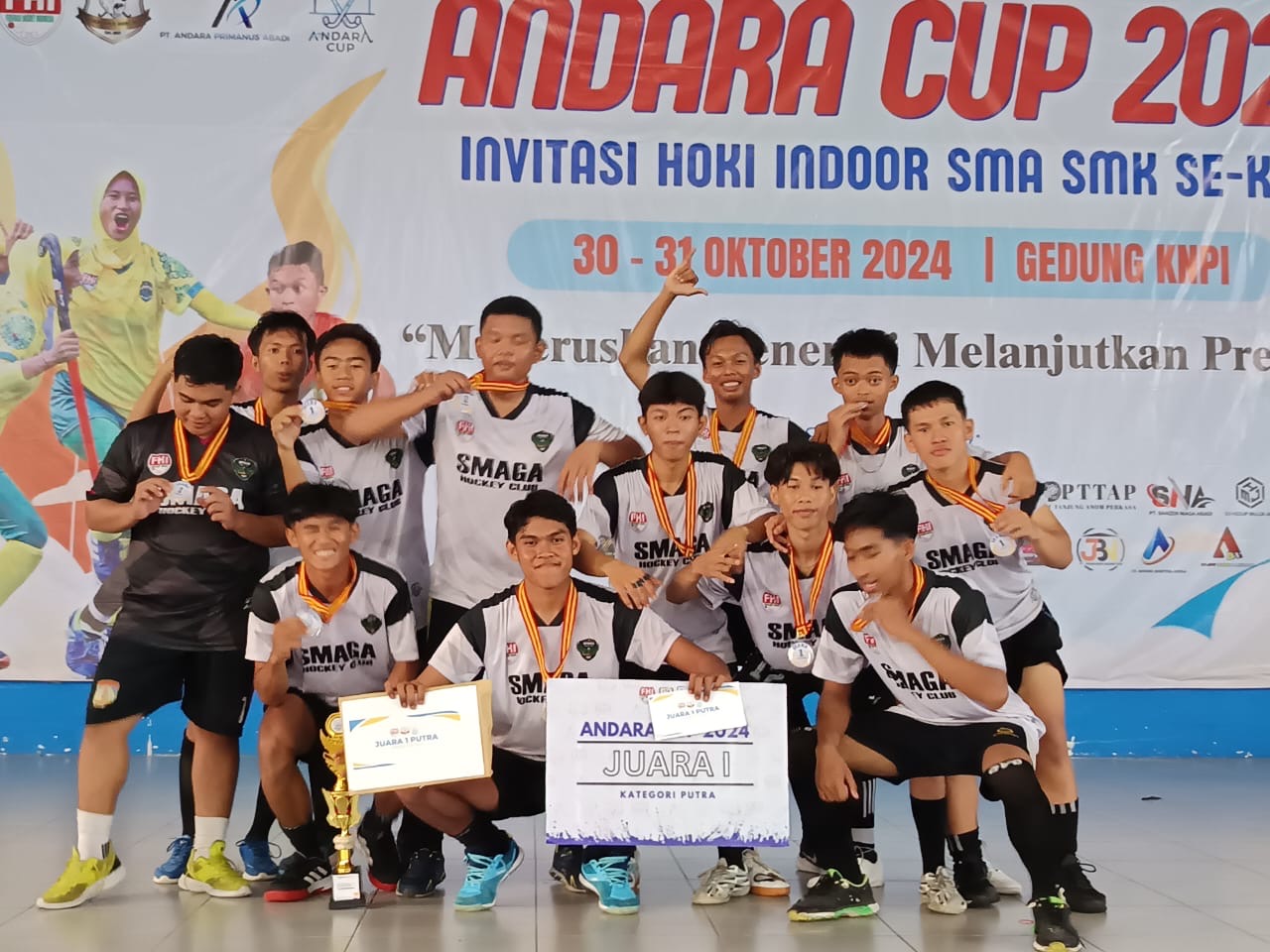 KaltimKita.com, BALIKPAPAN - Wakil Balikpapan berhasil mendominasi di Turnamen Hoki Antar Pelajar SMA/SMK se-Kaltim bertajuk Andara Cup 2024. Dua sekolah asal Kota Minyak ini, baik putra dan putri sukses menang di babak puncak kategori indoor yang berlangsung di Aula KNPI, Kamis (31/10/2024).