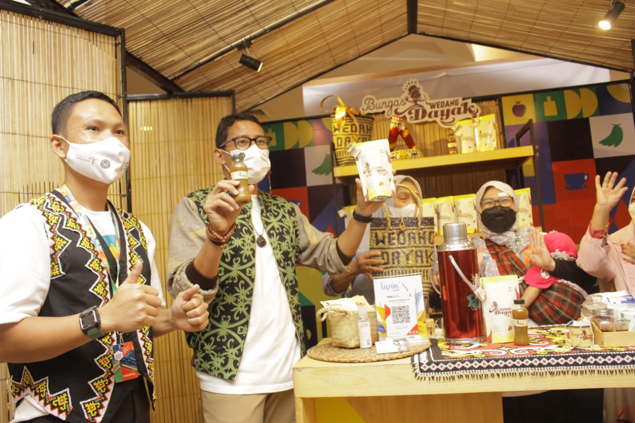 Menteri Pariwisata dan ekonomi Kreatif (Menparekraf) Sandiaga Uno saat mengapresiasi kehadiran wedang dayak ddalam acara Apresiasi Kreasi Indonesia 2022.