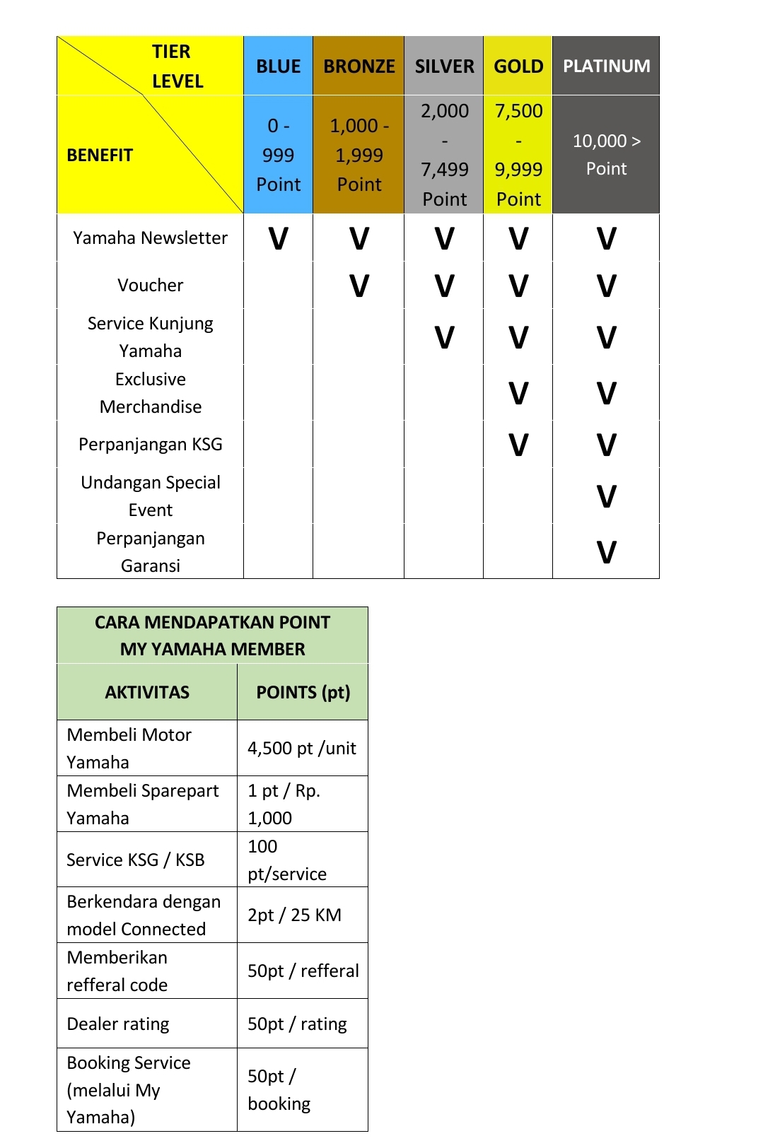 Program My Yamaha Motor Members memberi keuntungan bagi seluruh konsumen Yamaha dengan mengumpulkan sebanyak-banyaknya point transaksi. Setiap aktivitas Bersama Yamaha dapat mendapatkan point yang akan dibagi berdasarkan 5 Tier; Blue, Bronze, Silver, Gold & Platinum. Setiap tier memiliki benefit yang berbeda, semakin banyak kita mengumpulkan point, semakin banyak kita bisa mendapatkan benefit dari My Yamaha Motor Member. Program ini dapat dinikmati oleh seluruh masyarakat Indonesia, baik pengguna maupun bukankan pengguna motor Yamaha yang melakukan transaksi pada dealer resmi Yamaha.